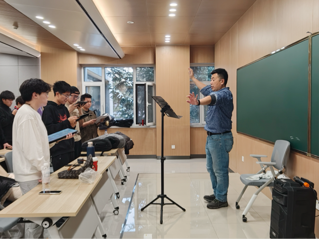 王旭鹏老师从作品的结构特点、语言发音和音乐表现等多个角度切入教学。他特别强调节奏的准确性与音乐层次的对比性,引导学生在实践中体验作品的戏剧性与力量感。针对演奏过程中的难点,王老师耐心调整细节,帮助学生更好地掌握曲目情绪的递进变化和整体节奏的流动感。通过此次课程,学生们不仅提升了合唱技巧,也进一步感受到了经典音乐作品的震撼力与艺术价值。