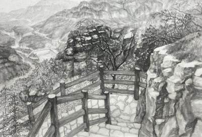 国画专业学生以水墨勾勒太行山石的嶙峋质感,通过虚实相生的构图与富于变化的笔墨,精准捕捉云雾缭绕的山谷气象,展现了中国传统山水画在当代写生中的创新表达。