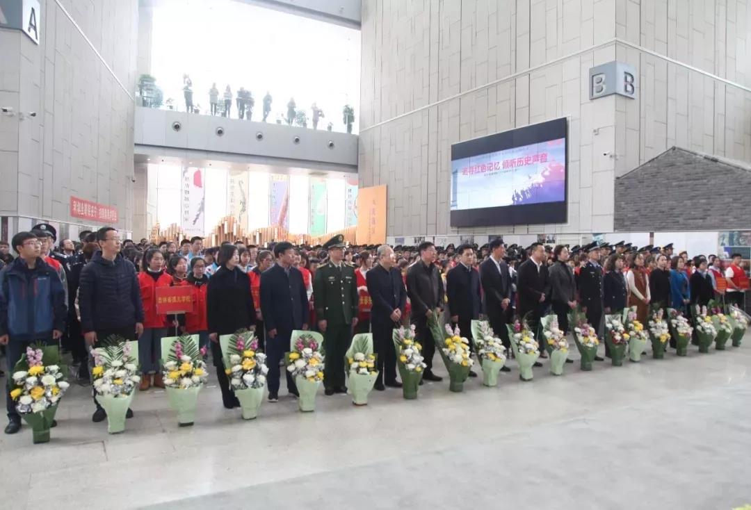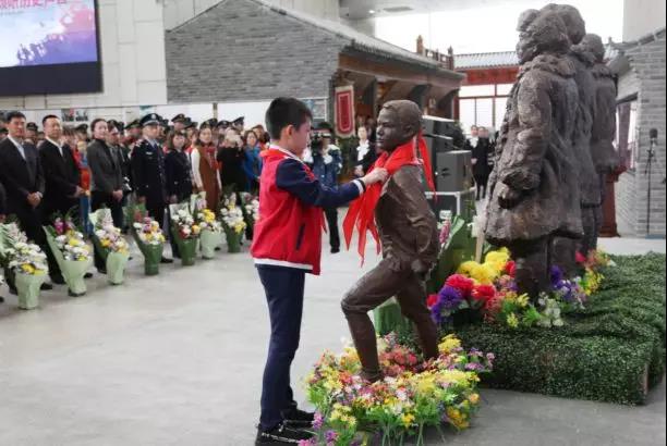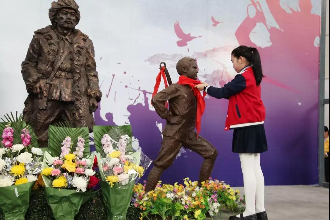 志愿者,手持黄色菊花,庄严肃穆,积聚在省博物院一层大厅,三名抗联将军和“小英雄”何畏的雕像引人注目,场内空军航空大学、武警吉林省总队机动支队、国家税务总局长春市宽城区税务局、东北师大附中明珠校区、长春市第52中学小学部、长春东光极速赛车