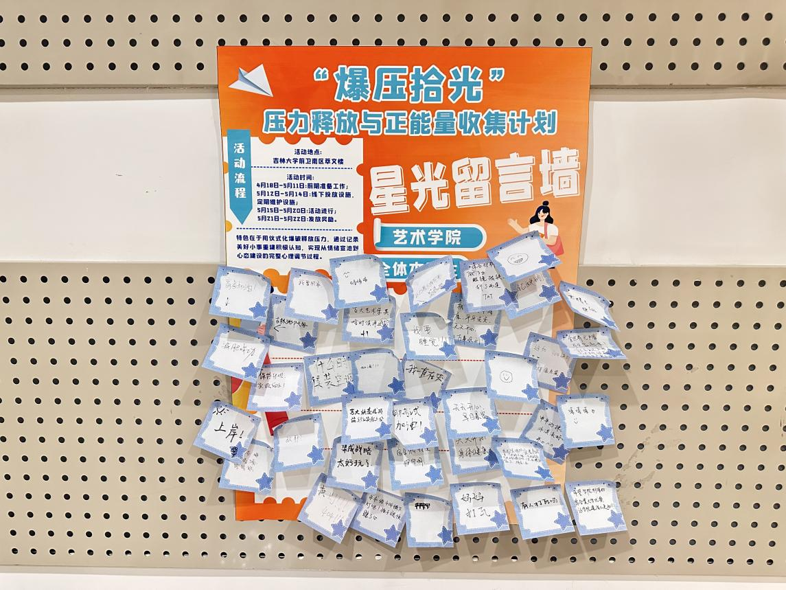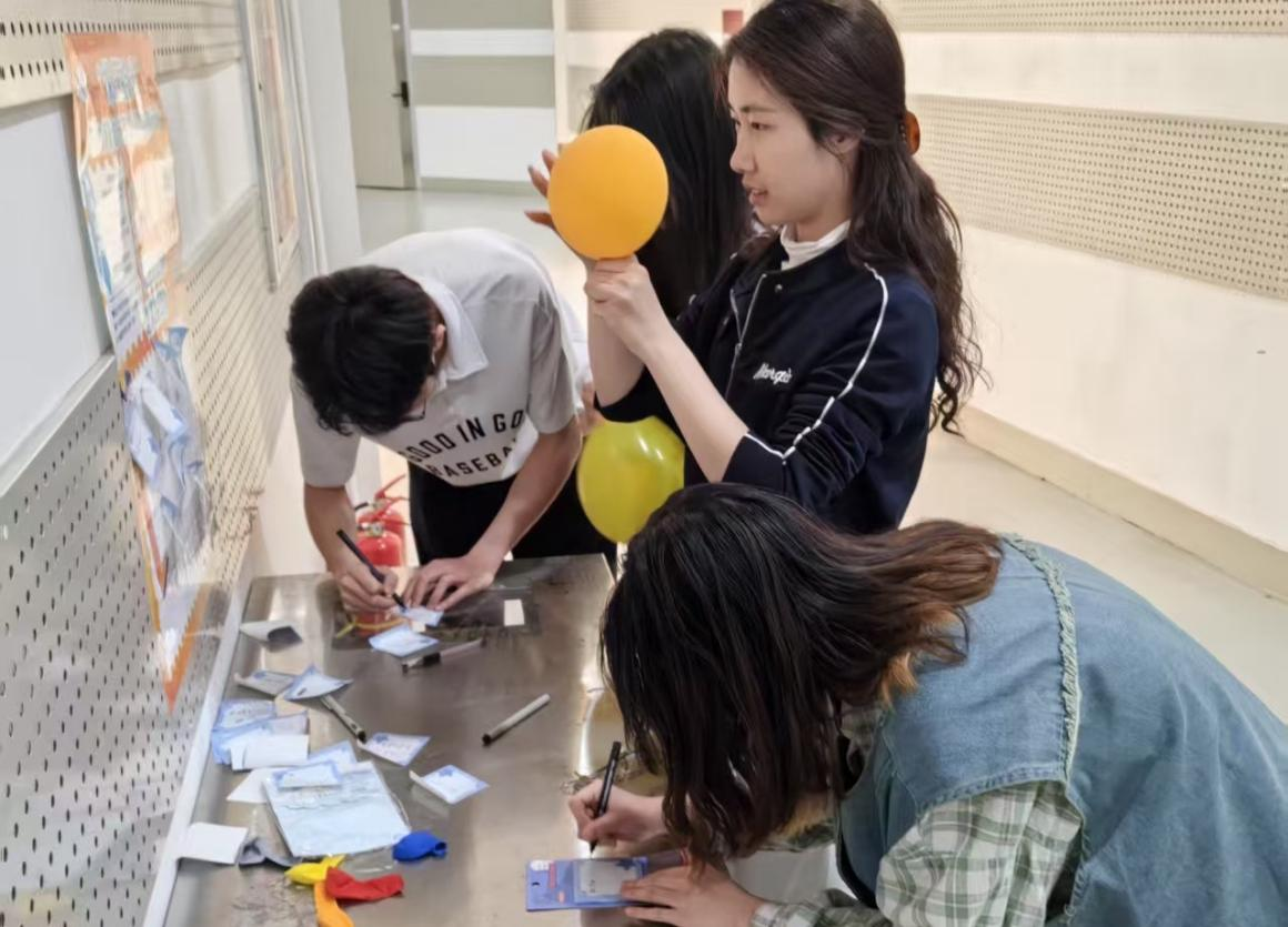 活动设置了两个特色环节,在“压力爆破区”,参与者匿名写下近期困扰,将纸条装入气球后踩爆,完成情绪宣泄。随后进入“星光能量站”,同学们将生活中的温暖瞬间记录在星形卡片,亲手粘贴在星光能量墙上。活动结束后,将制作线上版“云端星光墙”,持续传递温暖记忆。通过“释放+重建”的互动模式,有效缓解了同学们的压力。