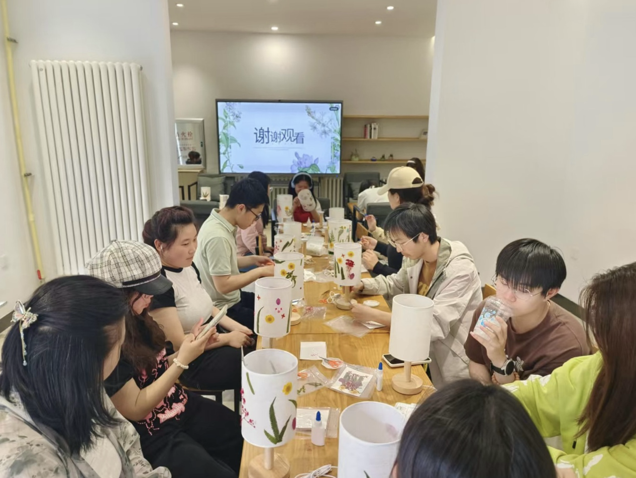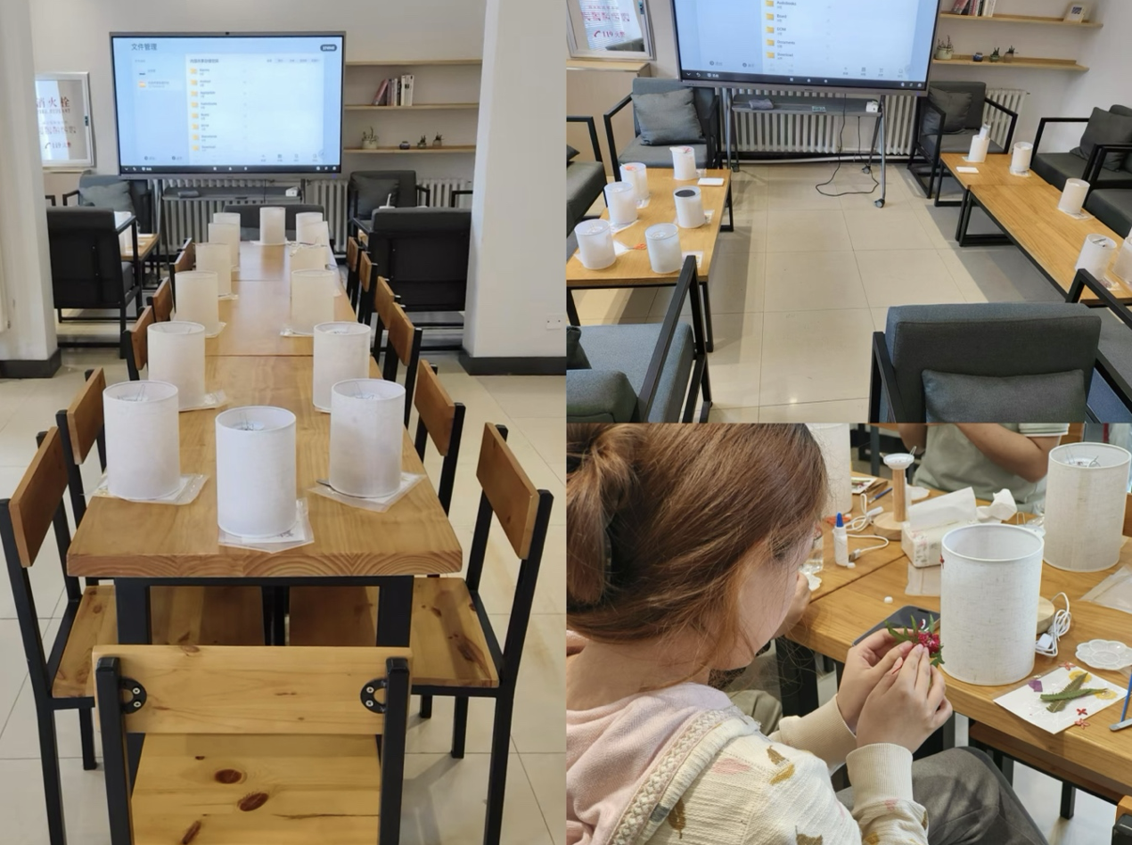 活动开始,焦雪萌同学向大家介绍了压花台灯的历史背景和工艺价值,同时讲解了制作流程。在志愿者的帮助下,同学们用植物标本在台灯上粘贴出设计图案,创造了独具个性的台灯作品。灯光与植物的结合使同学们感受到了艺术创作的乐趣。最后,同学们进行了作品展示,并互相交流了制作感悟。