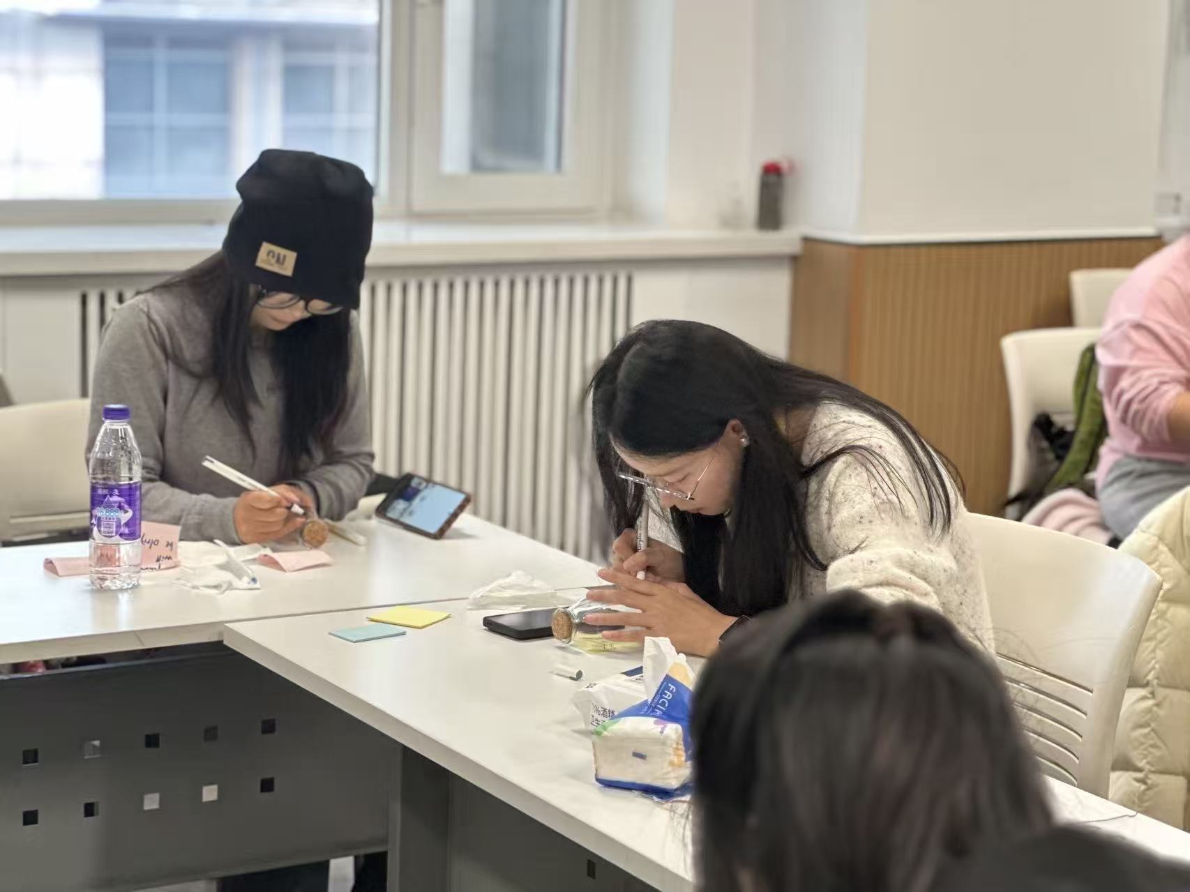 活动伊始,现场陈列的各类瓶子颇具巧思,同学们挑选完心仪的瓶子便手握画笔、专注投入。笔尖在瓶身流转,色彩在瓶身绽放,将内心的思绪与美好期许,一点点化作瓶身上的生动图景。手绘环节落幕,温馨的“寄语互换”环节接续登场。同学们拿起便利贴,将心底的善意与祝福细细写下。大家将写满祝福的便利贴轻轻贴在黑板上,也可随心取用他人的温暖留言,让陌生的善意跨越距离,在彼此心间流淌。最后,同学们带着承载着创意与祝福的手绘瓶离开,将这份独特的温暖记忆悉心珍藏。