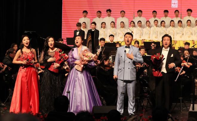 音乐会在恢弘澎湃的《第一交响序曲》中拉开帷幕,丰富的配器和声、波澜起伏的节奏,描绘出一幅革命先辈们前赴后继、波澜壮阔的历史画卷。由李鸿独唱的歌曲《为艺术,为爱情》感情强烈而深厚,《晴朗的一天》旋律舒缓而甜美。《小嘴巴》《我的太阳》等歌曲在戴玉强的演绎下,让现场观众在感动中沉浸于美妙的歌声里。戴梓伊演唱的歌剧《西西里晚祷》选段《多谢好朋友》,激情富有节奏感的演唱,赢得观众的阵阵掌声。《喀秋莎》《红莓花儿开》《卡林卡》等民歌名曲联唱将音乐会推向高潮。当《我和我的祖国》旋律响起,全场观众起立与台上演员一同歌唱,音乐会圆满落下帷幕。