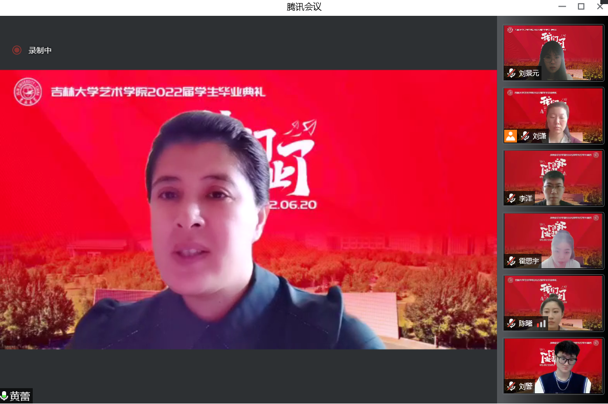 院长郭春方教授致词。他以《文以载道艺以弘德》为题,从三个方面与毕业学子分享关于艺术与人生追求的思考,作为母校为同学们准备的最后一份“毕业礼物”。一是文艺创作,要为时代放歌。文艺是时代前进的号角,文艺创作只有植根现实生活、紧跟时代潮流,才能真正做到思想精深、艺术精湛、制作精良。疫情暴发以来,全院师生创作了系列以抗击疫情为主题的优秀作品,讲述着我们身边的抗疫故事。文艺最能代表一个时代的风貌,也最能引领一个时代的风气。在以“艺”抗疫的征途上奋勇向前,在前所未有的困境中携手前行,共同感受着党和国家在抗击灾难时所爆发出的巨大能量,力尽所能地肩负起吉大人的使命与担当。二是文艺创作,要扎根祖国大地。当代的中国文艺,是包含艺术哲学与精神内涵的时代产物,是反映中华民族精神面貌与审美趣味的文化沉淀,是能够服务于国家需求并引领结构创新的艺术符码。需要在复杂的时代价值环境中,注重全球共识性与民族个性的融通,注重中国语境与国家文明的坚守。扎根祖国大地,发出中国声音,讲述中国故事,扩大“中国艺术”的影响力,是每一名文艺工作者义不容辞的使命与责任。三是文艺创作,要回应民之关切。“中国艺术的生命精神,就是一种以生命为本体,为最高真实的精神”。艺术的真实来源于生活,并对其进行提炼和萃取。文艺工作者的世界观决定了创作过程中的立场、态度和情感。修辞立其诚,艺术之路上,思想的高度、文化的传承、科技的创新,都离不开以人民为中心的创作导向。正如七十六载来,吉大以毫不利己、专门利人的白求恩精神;以一路向北、扎根东北的“北上精神”;以心有大我、至诚报国的黄大年精神,为国家的发展、民族的振兴、社会的进步作出了巨大的贡献。